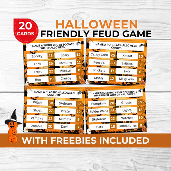 Printable Halloween Friendly Feud Game for Family & Kids – Fun Fall Party Game + FREE Halloween Charades Cards and Unique Photo Booth Props
