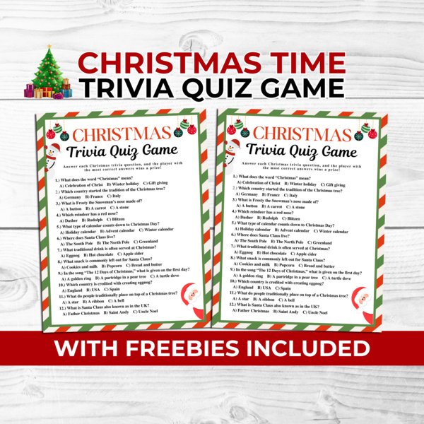 Christmas Trivia Game Printable for Kids, Adults & Families – Festive Holiday Quiz Activity with Bonus Bingo Game and Photo Booth Props