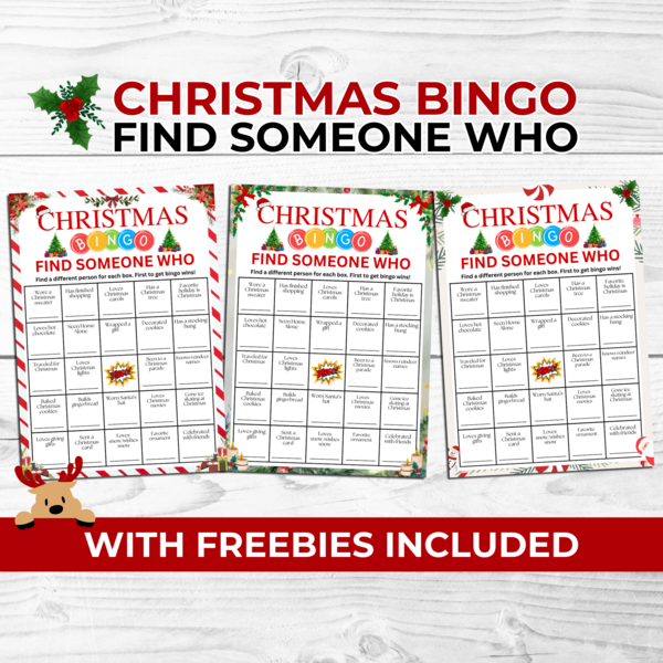 Christmas Bingo – Find Someone Who Game | Fun Printable Holiday Party Activity for Kids, Teens & Adults + Bonus Charades Game & Photo Booth Props