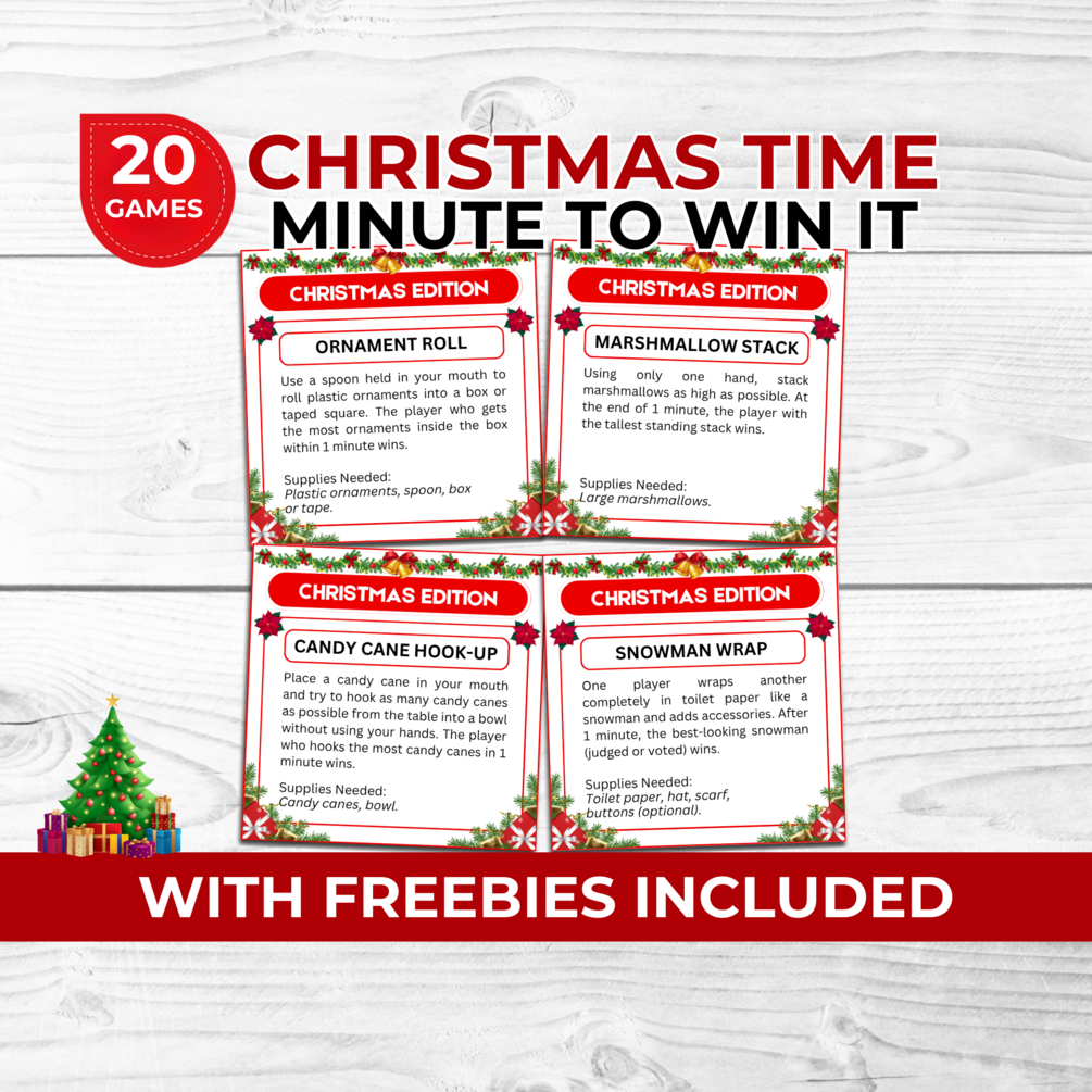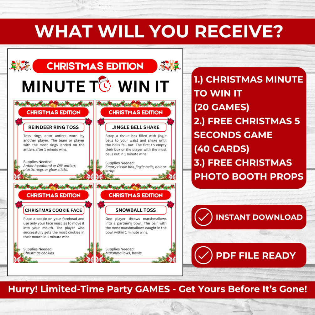 What’s Included? 1.)Christmas Minute to Win It Games(20 Games) 2.)Free Christmas 5 Seconds Game (40 Cards) 3.)Free Christmas Themed Photo Booth Props