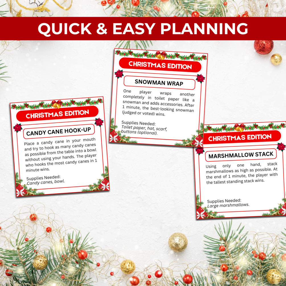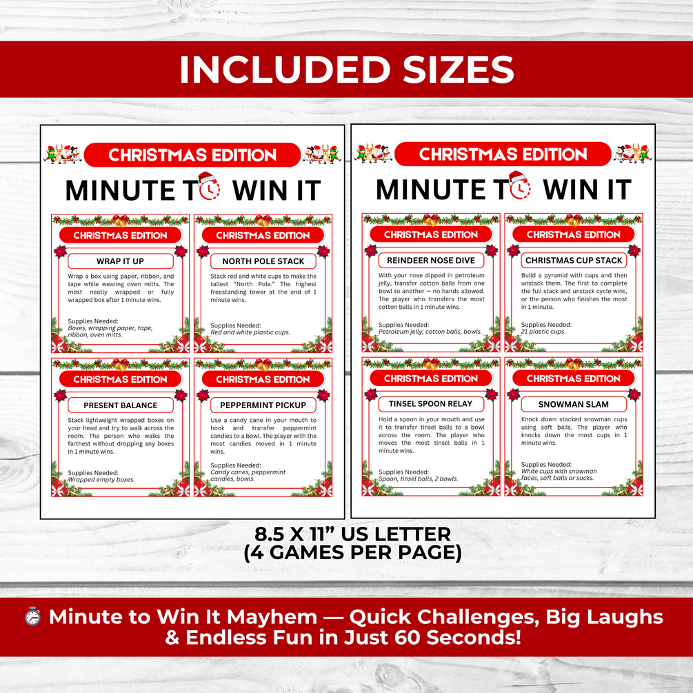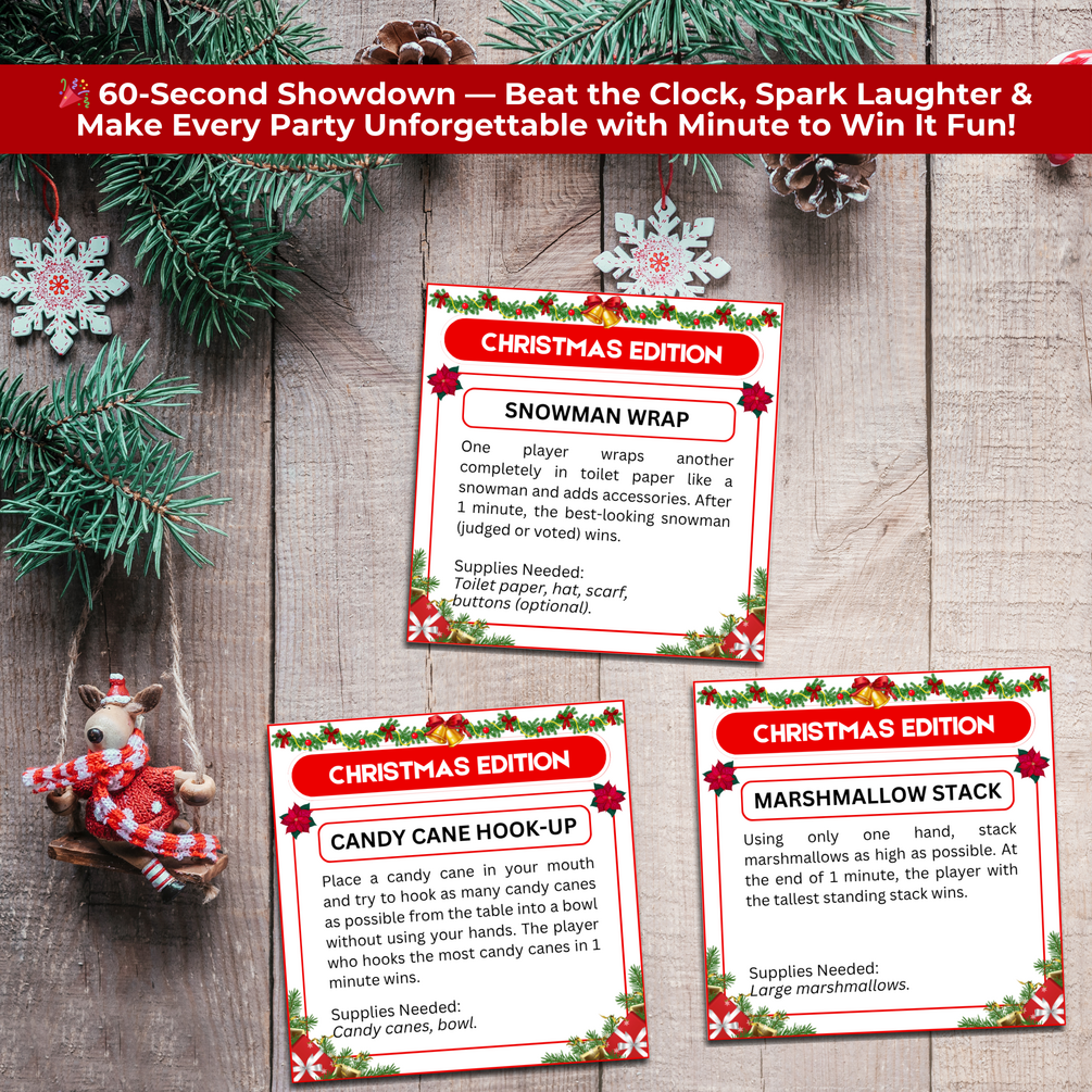 Bring the holiday cheer to life with our Christmas Minute to Win It Games Printable Bundle – the ultimate party starter for families, kids, adults, school events, and office celebrations! These quick, hilarious challenges keep everyone laughing, moving, and bonding throughout your Christmas gathering.