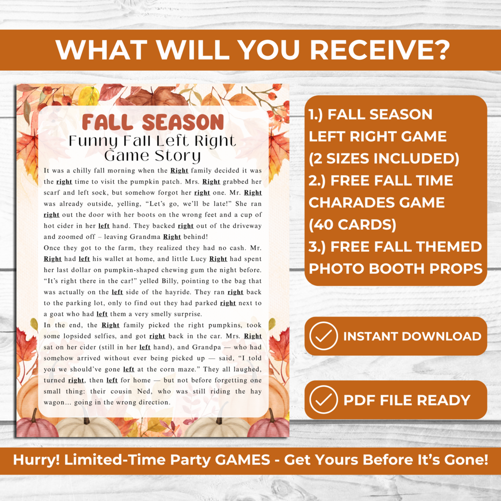 VISIT FOR MORE!What’s Included? 1.)Fall Left Right Game (2 Sizes) 2.)Free Fall Charades Game (40 Cards) 3.) Free Fall Themed Photo Booth Props