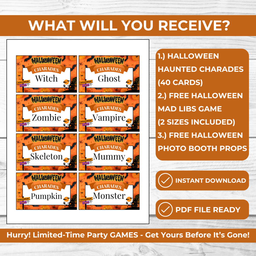 What’s Included? 1.)Frightful Halloween Charades Game(40 Cards) 2.)Free Halloween Mad Libs Game (2 Sizes) 3.)Free Halloween Themed Photo Booth Props