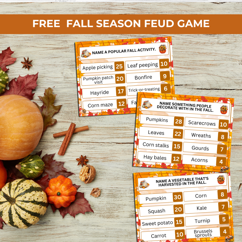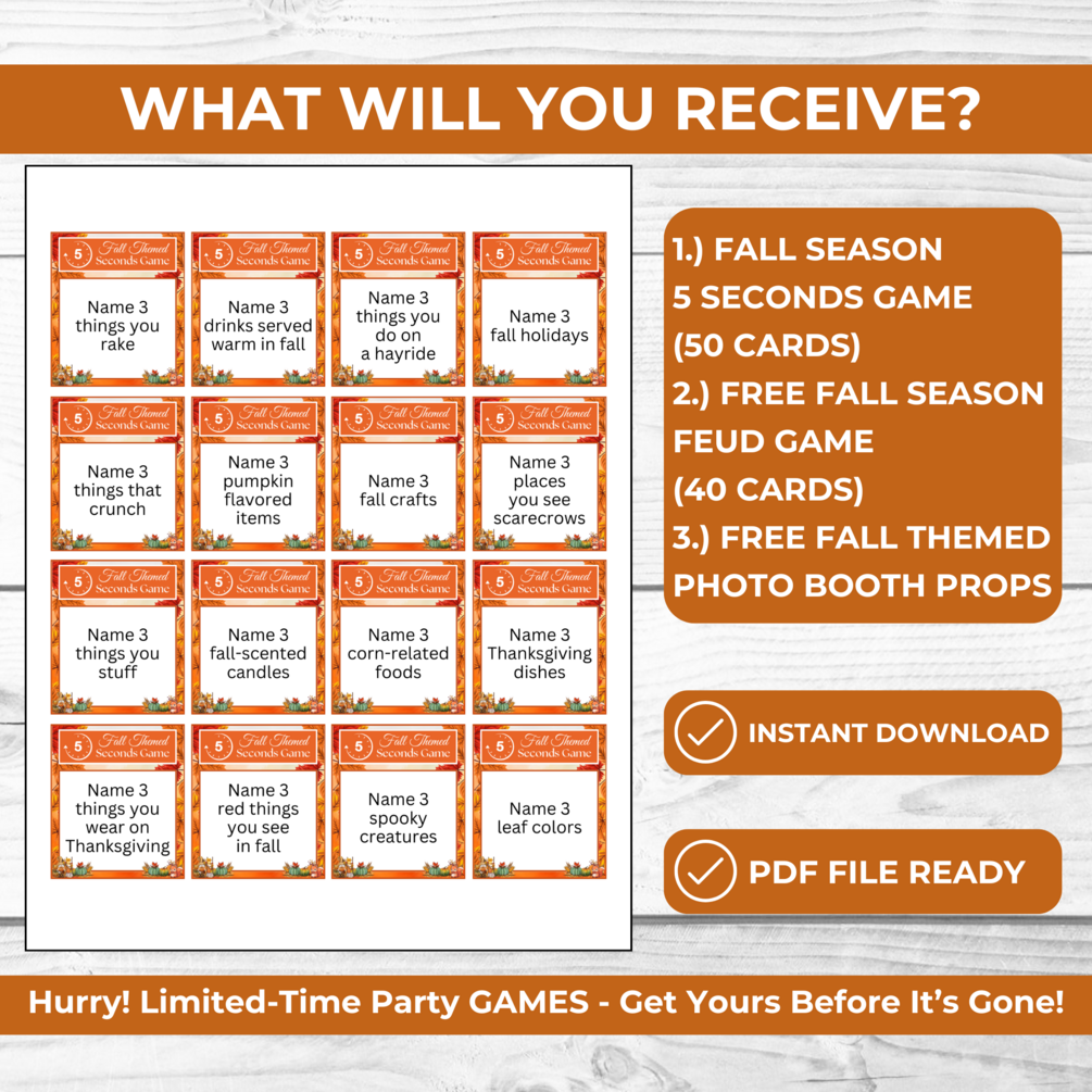 VISIT FOR MOREWhat’s Included? 1.)Fall 5 Seconds Game(50 Cards) 2.)Free Fall Friendly Feud Game (40 Cards with Score Boards) 3.)Free Fall Themed Photo Booth Props 4.) Answer Covers