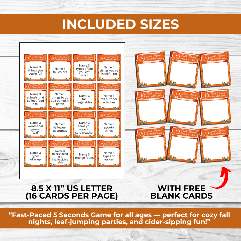 🍂 Get ready for laughter and quick thinking with this Printable Fall 5 Seconds Game — perfect for kids, teens, and adults at autumn parties, family nights, school events, or Thanksgiving gatherings! Players have just 5 seconds to list 3 things from fun fall-themed prompts, making it an exciting and easy-to-play activity that keeps everyone engaged.