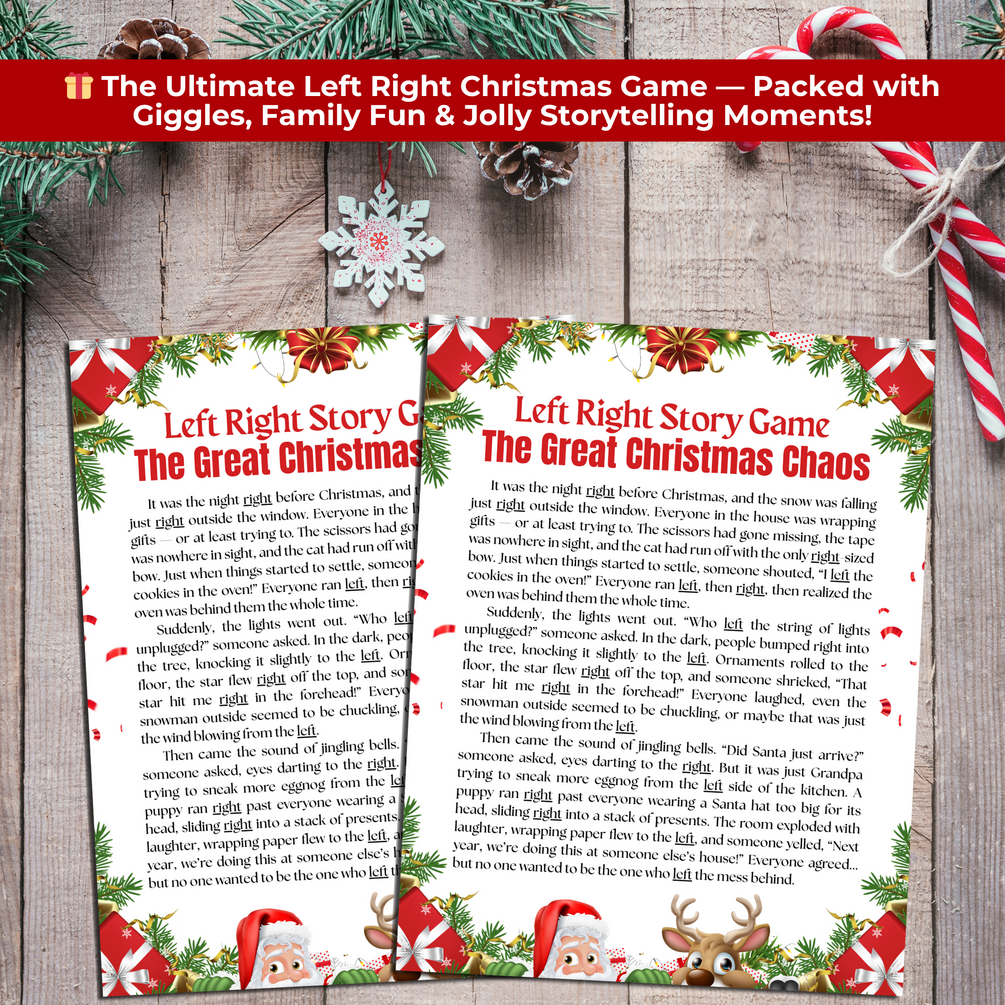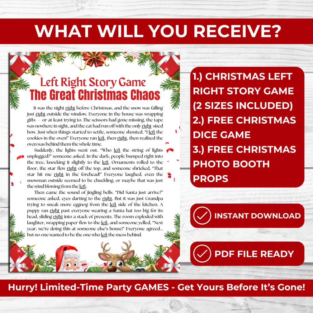 Christmas Left Right Game Printable – Fun Holiday Story Game for Families, Adults & Kids with Free Candy Dice Game and Photo Booth Props