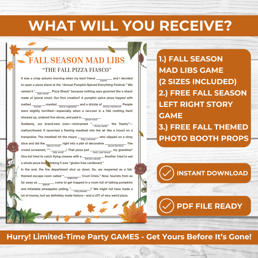 Funny Fall Mad Libs Printable Game – Autumn Party Activity for Kids & Adults + Free Left Right Story & Photo Booth Props