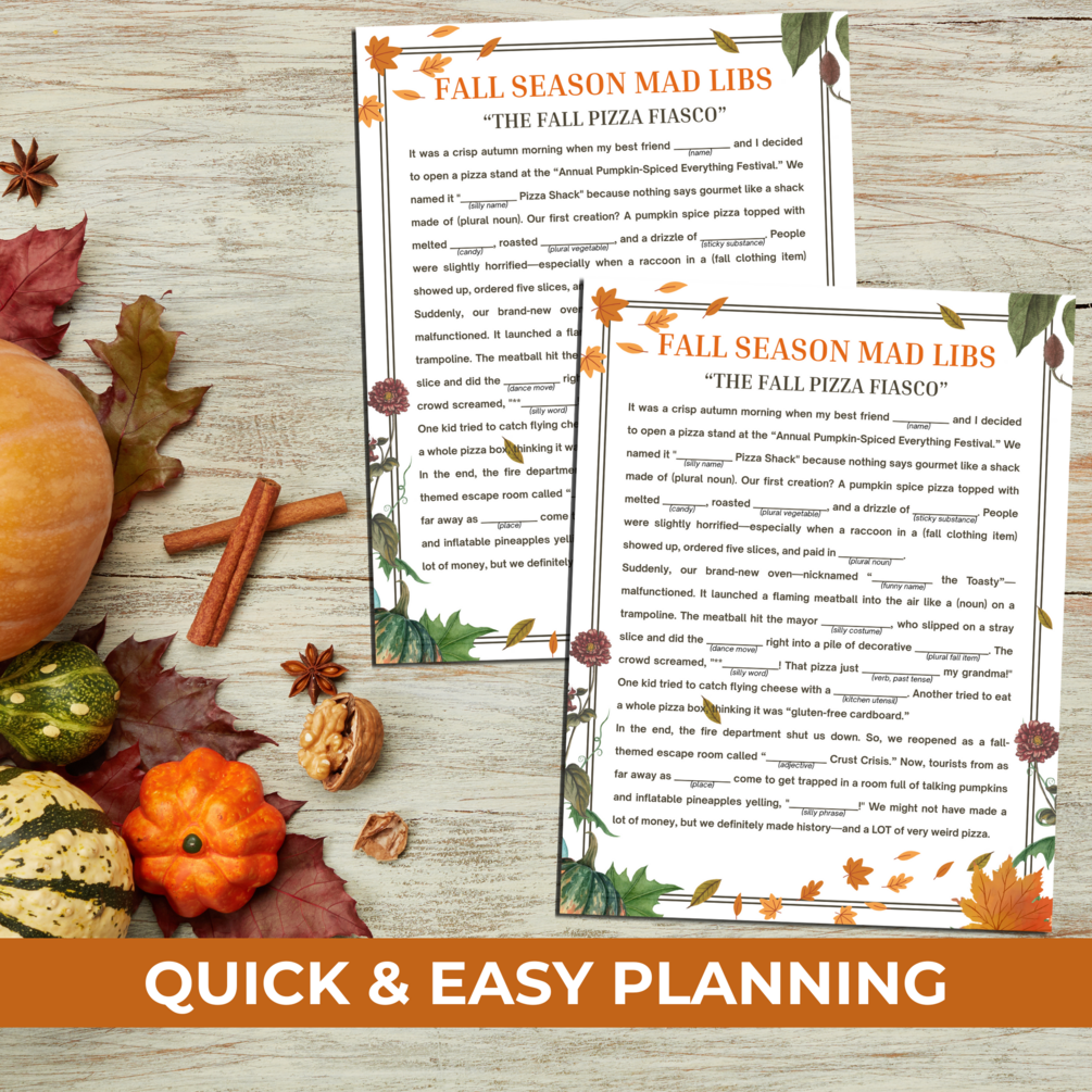 1 pdf (US Letter Size) Fall Mad Libs Story Game (2 Games Per Page)