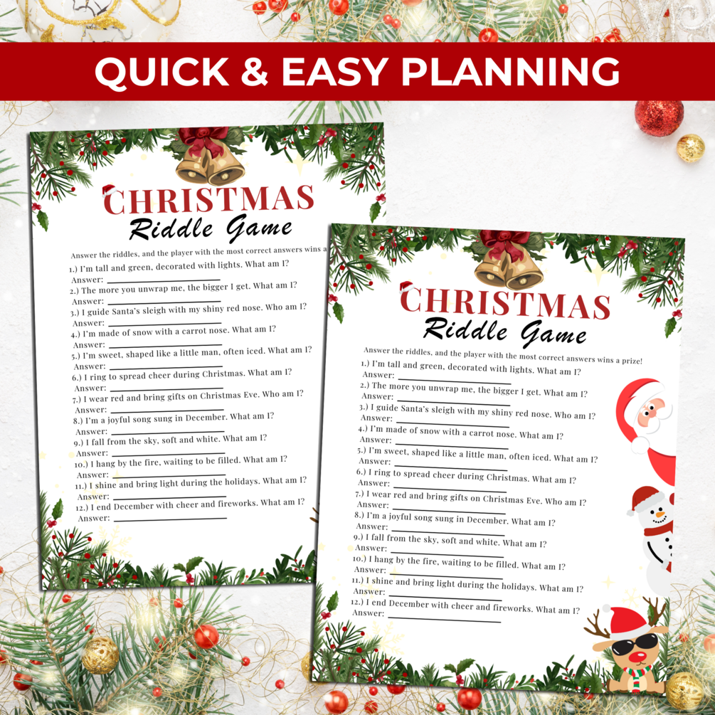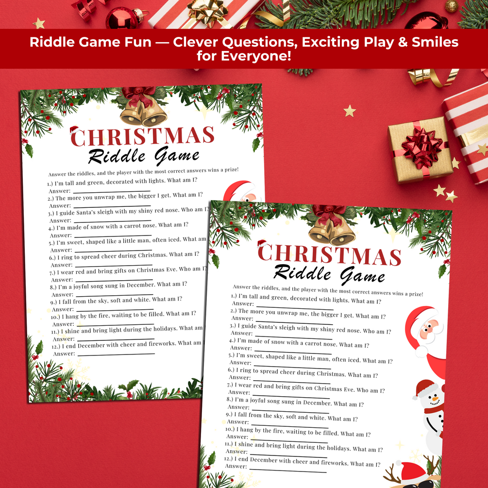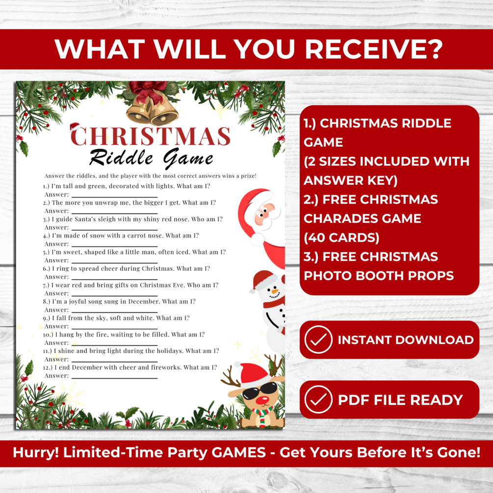 Festive Christmas Riddles Game Printable – Fun Holiday Party Activity for Kids, Teens & Adults + FREE Charades Game & Photo Booth Props
