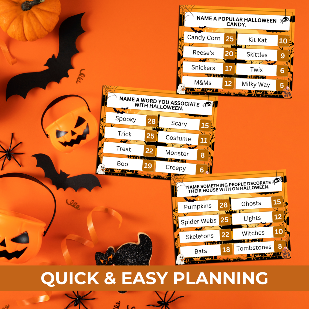 This fun and easy-to-play Halloween game is designed to entertain guests of all ages. With 20 survey-style questions and answers, your crew will compete in teams to guess the top responses—just like the classic game show! It’s the ultimate party activity that keeps everyone engaged and laughing.