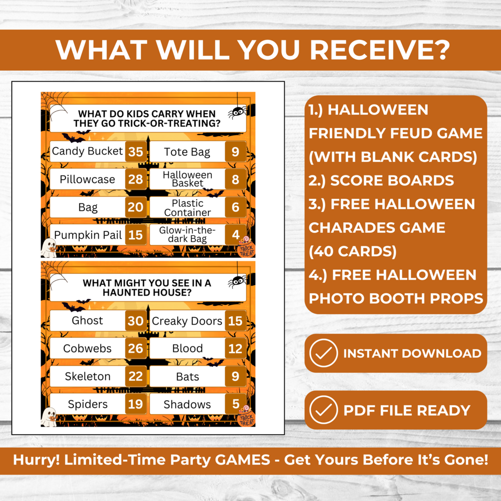 Printable Halloween Friendly Feud Game for Family & Kids – Fun Fall Party Game + FREE Halloween Charades Cards and Unique Photo Booth Props