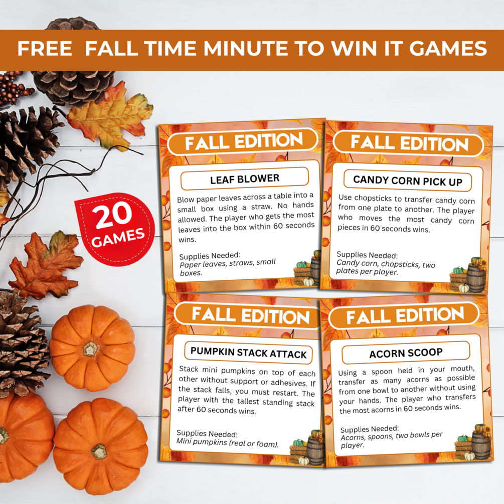 What’s Included? 1.)Printable Fall Trivia Game (2 Sizes with Answer Key) 2.)Free Minute to Win it Games (20 Games) 3.) Free Fall Themed Photo Booth Props