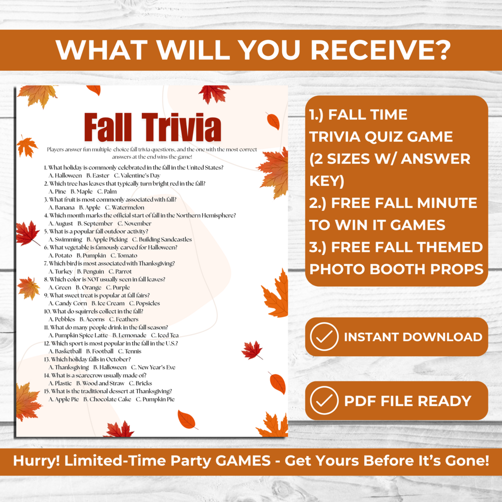 Printable Fall Trivia Game for Family Gatherings, Kids & Adults – Fun Autumn Party Activity with Free Minute to Win It Challenges & Photo Booth Props