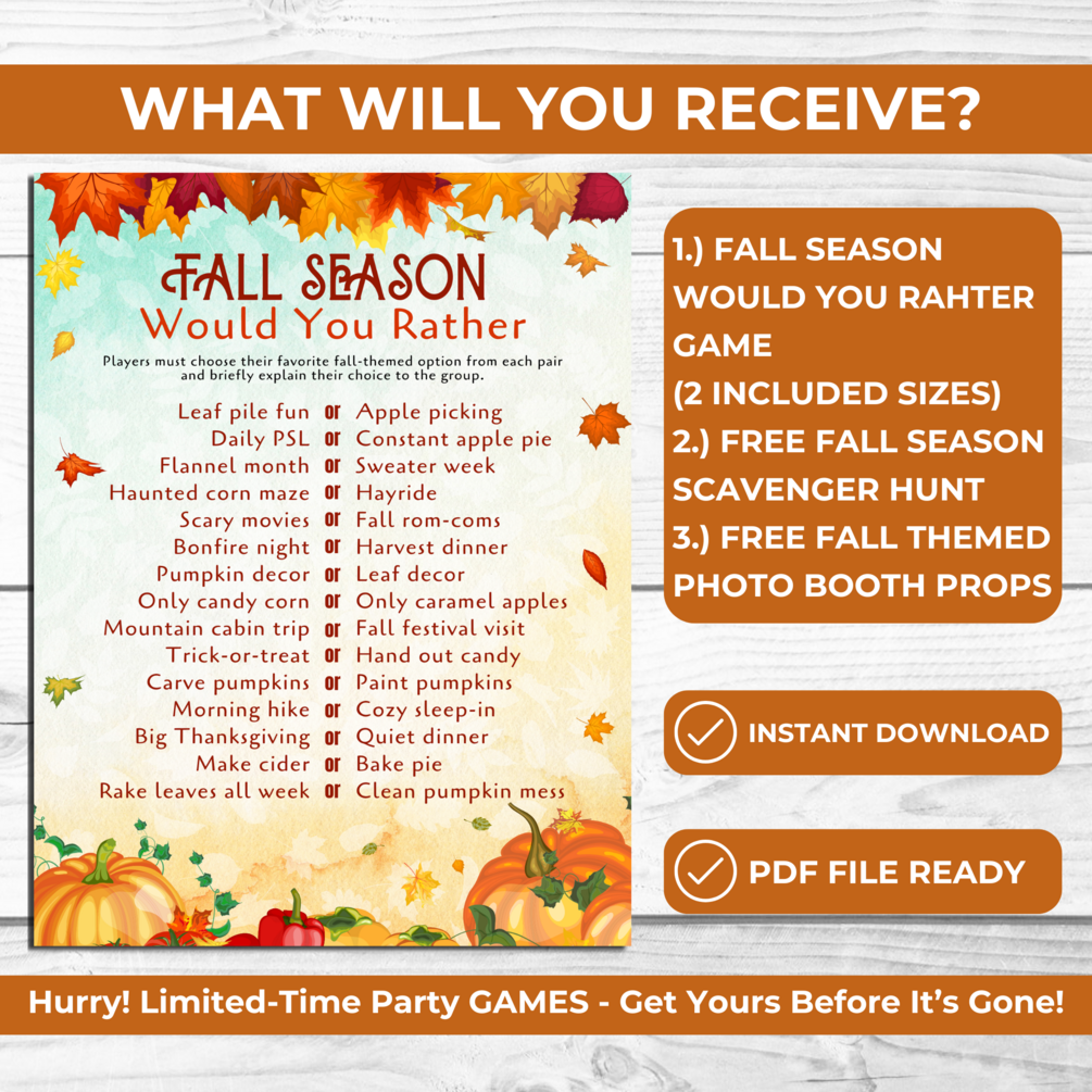 What’s Included? 1.)Fall Would You Rather Game(2 Sizes) 2.)Free Fall Scavenger Hunt Game 3.)Free Fall Themed Photo Booth Props