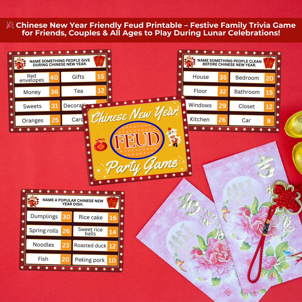 Featuring 30 entertaining feud-style questions inspired by Lunar traditions, zodiac animals, lucky foods, and cultural customs, this game is perfect for New Year dinners, family reunions, classroom activities, and holiday parties. Easy to print and simple to play, it’s a crowd-pleasing activity everyone can enjoy together.