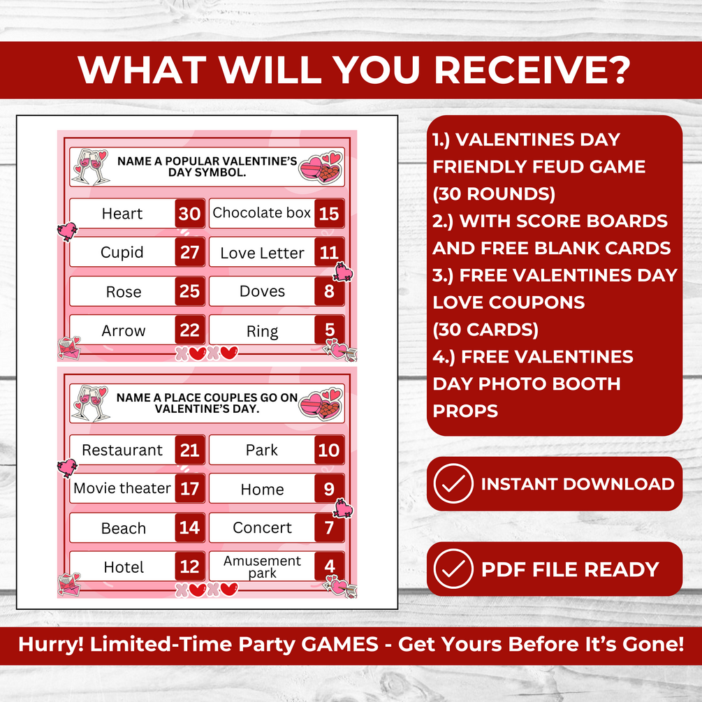 What’s Included? 1.) Valentine’s Day Friendly Feud Game(30 Rounds) With Blank Cards, Score Boards and Front Cover 2.)Free Valentines Day Love Coupons (30 Cards) 3.)Free Valentines Day Themed Photo Booth Props