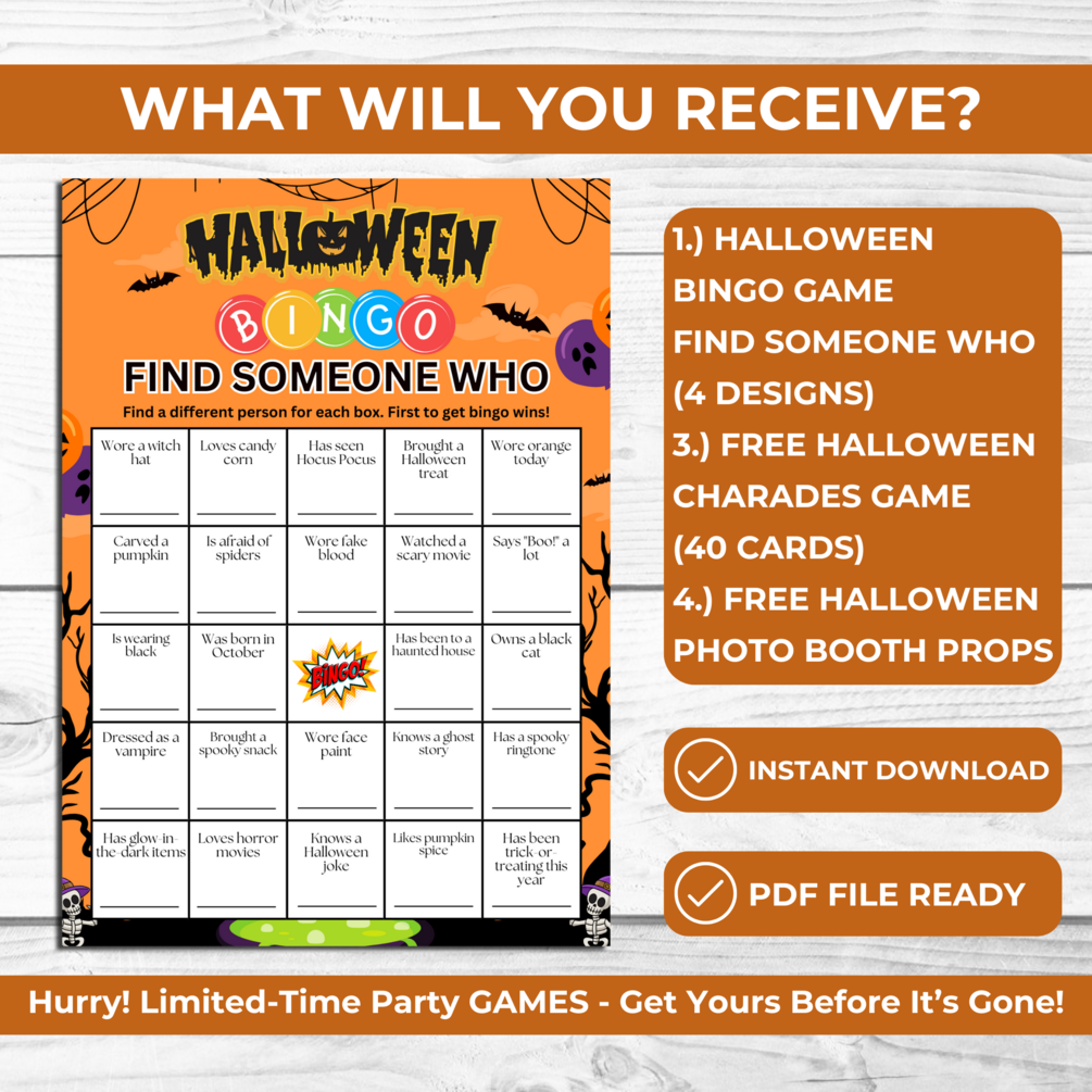 Halloween Bingo Game Find Someone Who – Fun Party Activity for Kids, Teens & Adults with Free Charades Cards + Photo Booth Props