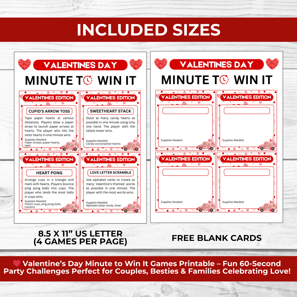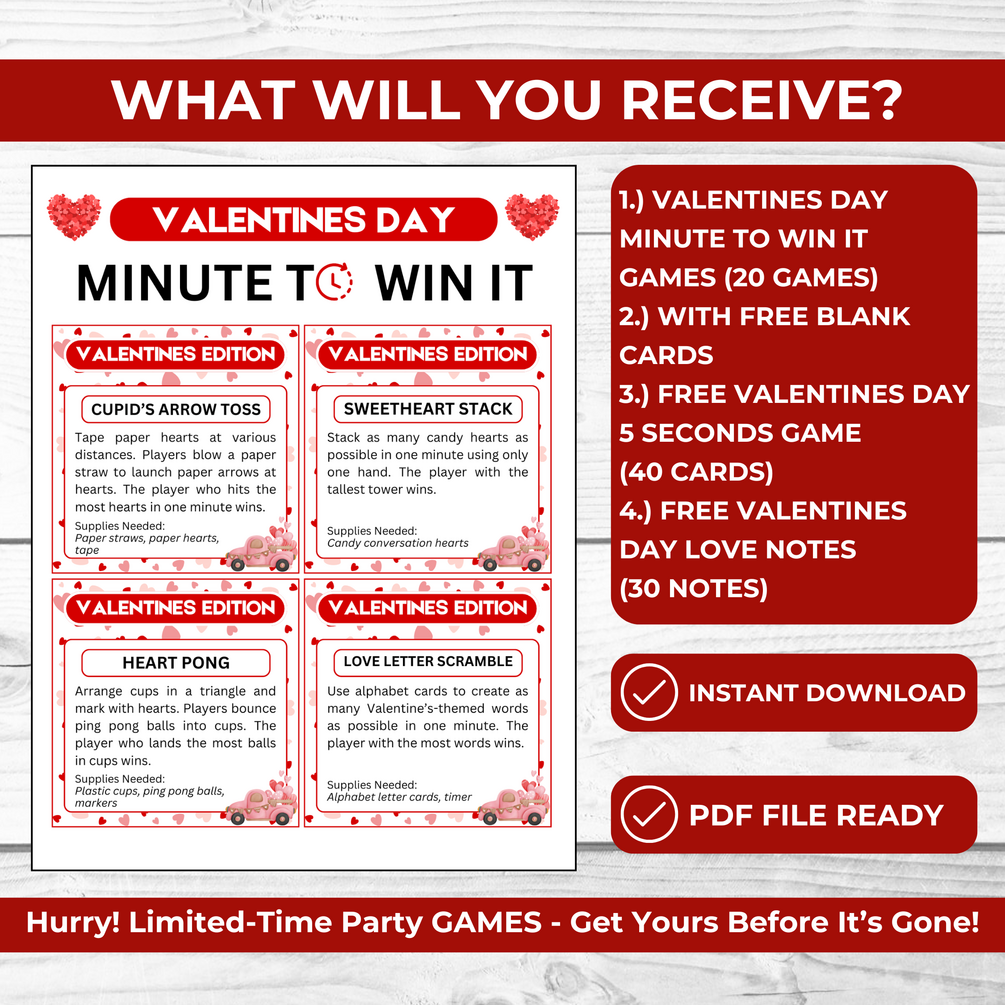 What’s Included? 1.) Valentine’s Day Minute to Win It Games(20 Games) 2.) With Blank Cards 3.)Free Valentine’s Day 5 Seconds Game (40 Cards with Blank Cards) 4.)Free Valentine’s Day Love Note Cards (40 Notes with Blank Cards)