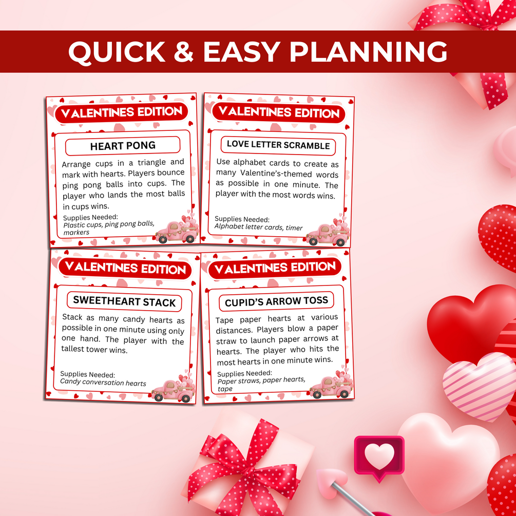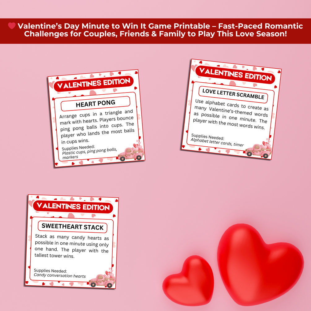 This printable party bundle features fast-paced Minute to Win It challenges, engaging 5 Seconds Game Cards, and sweet & funny Love Notes that add extra charm to your Valentine activities. Created for quick and easy hosting, these games are ideal for last-minute plans and require minimal setup—many challenges can be played with items you already have at home.